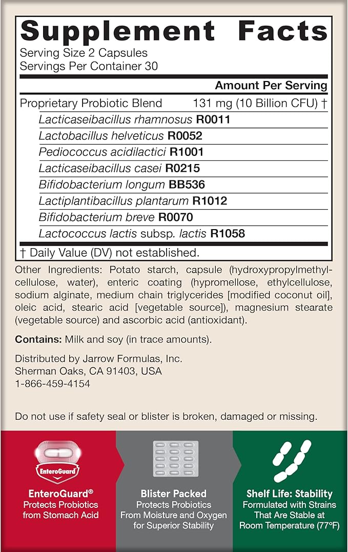 - Blister-packed Jarro-Dophilus probiotics featuring proprietary Enteroguard coating to protect the friendly bacteria in each capsule from stomach acid for daily gut balance