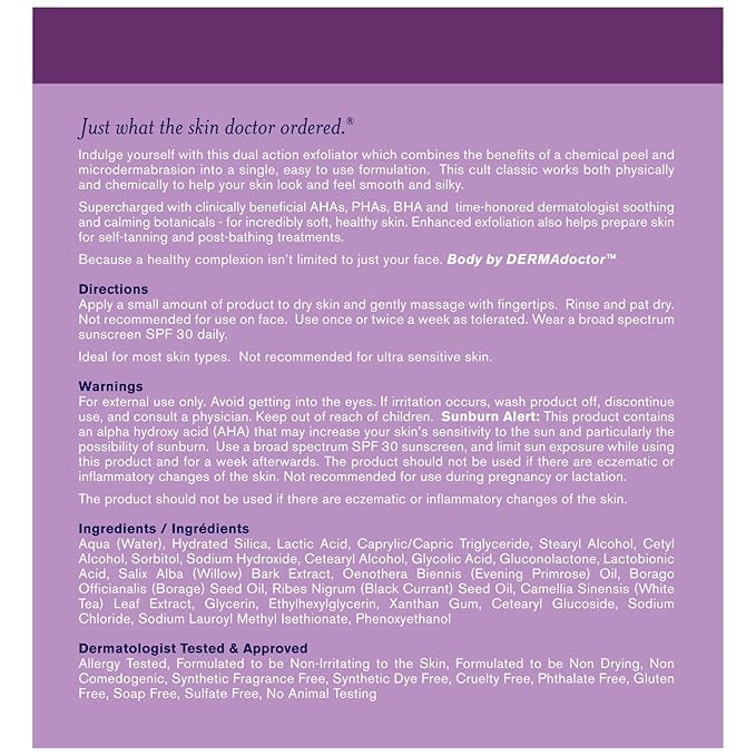 - WHAT IT DOES: Contains 10% AHAs + PHAs, merging the benefits of a chemical peel and microdermabrasion into one easy-to-use formulation. innovative formula combines traditional dermatologist remedies with the latest skincare science to significantly improve the appearance of dry, rough, bumpy skin and keratosis pilaris (chicken skin).Your new go-to body scrub: Smooths razor or shaving bumps, frees ingrown hairs, improves body discoloration (like dark knees or elbows), reduces back acne, decongests pores, removes impurities, and is perfect for self-tanner preparation or removal.
