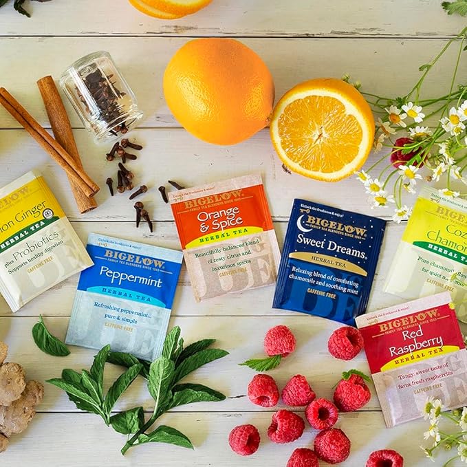 - Caffeine-free variety: 108 tea bag variety pack Includes Peppermint, Red Raspberry, Lemon Ginger Plus Probiotics, Orange and Spice, Cozy Chamomile and Sweet Dreams Herbal Teas; delicious hot or iced
