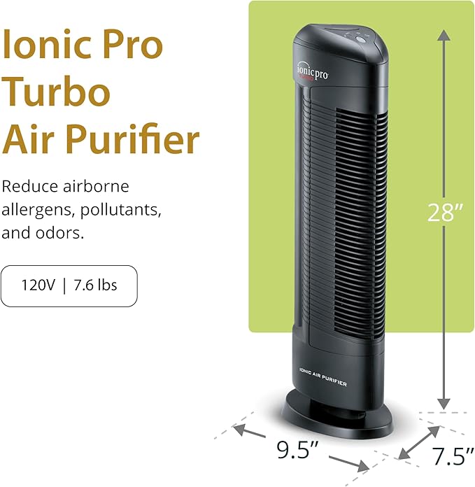 Ionic Pro Turbo (TA550) Ionic Air Purifier Tower for Home, Quiet Ionic Filterless Design, Covers Up to 500 Sq. Ft., Removes Odors, Smoke, Dust, and Allergens – Black