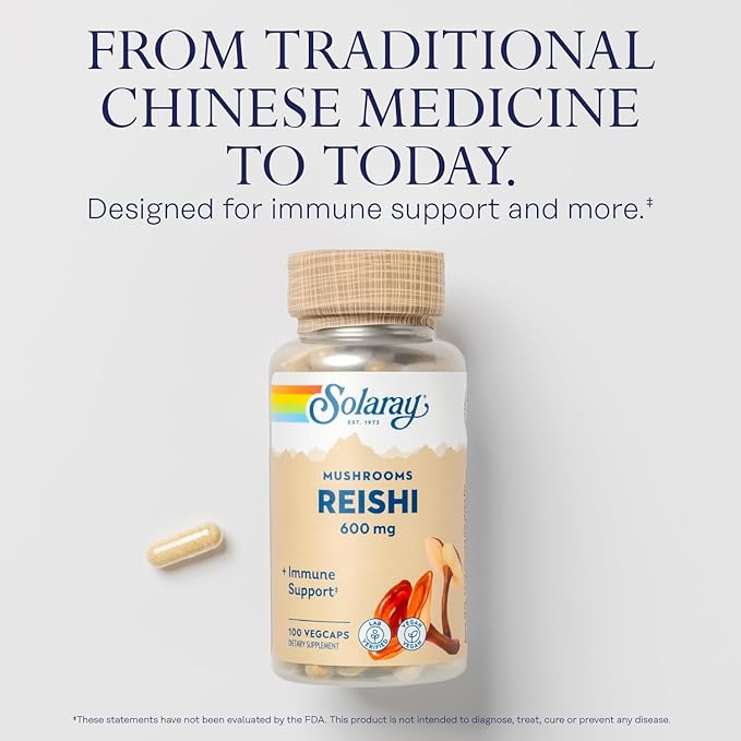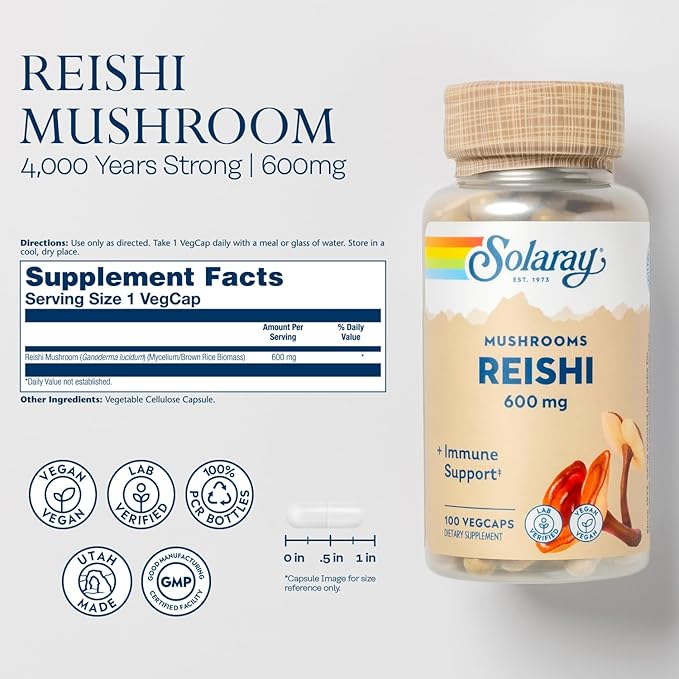 SOLARAY Reishi Mushroom 600mg - Reishi Mushroom Capsules for Immune Support - Vegan, Lab Verified - 60-Day Money-Back Guarantee - 100 Servings, 100 VegCaps