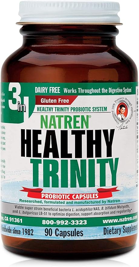 - Natren Healthy Trinity Probiotic: Healthy Trinity capsules are an amazing potent 3-in-1 probiotic supplement. Each non-dairy probiotic capsule contains a minimum of 30 billion colony forming units (cfu) of three potent, super strains of beneficial bacteria. Each Natren Healthy Trinity probiotic capsule provides a minimum of Lactobacillus acidophilus, NAS super strain, Bifidobacterium bifidum, Malyoth super strain, Lactobacillus bulgaricus, LB-51 super strain. 90 count capsules included.