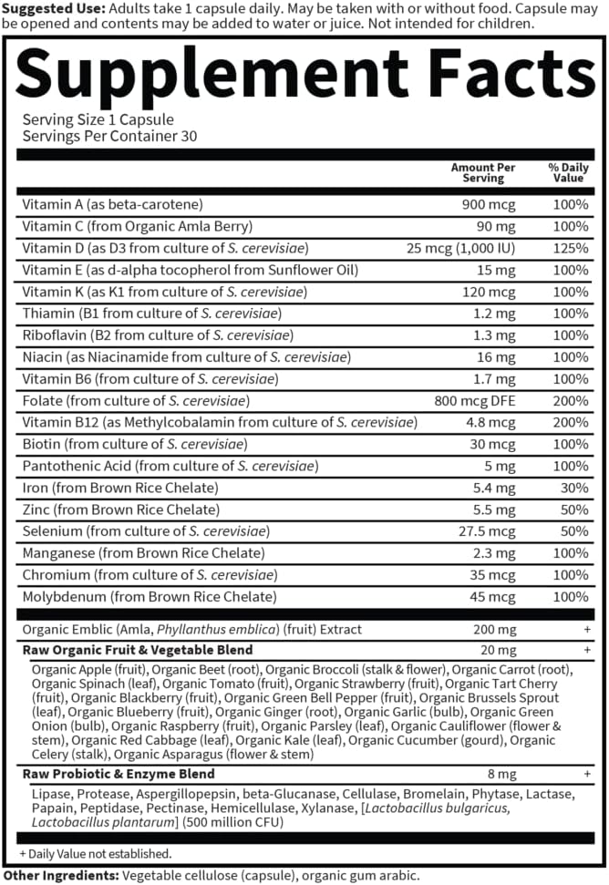 - MULTIVITAMIN WITH PROBIOTICS & WHOLE FOODS: One a day women's vitamins support energy, metabolism as well as radiant skin and nails; 24 powdered organically grown raw fruits and vegetables add supporting antioxidants, vitamins & nutrient cofactors