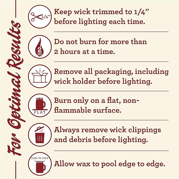 - Lead free wick with patented straightener to ensure proper burning every time; Keep wick trimmed to 1/4" and remove wick holder before lighting.