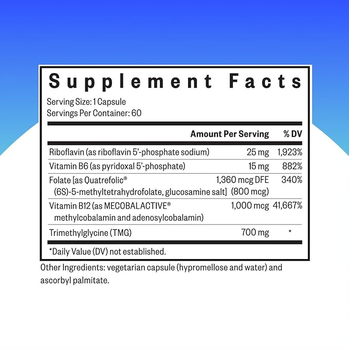 - Comprehensive formula: Folate (L-methylfolate or 5-MTHF), R-5-P (riboflavin 5’-phosphate), Vitamin B12 (methylcobalamin & adenosylcobalamin), and P-5-P (pyridoxal 5’-phosphate) work together to support your homocysteine pathway
