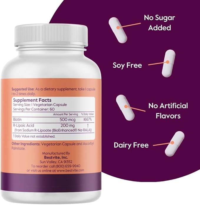 - PURE FORMULA: Bestvite R-Lipoic Acid contains no stearates, is non-GMO, gluten-free, and vegan. Each capsule contains 200 mg of R-Lipoic Acid and 500mcg of Biotin.