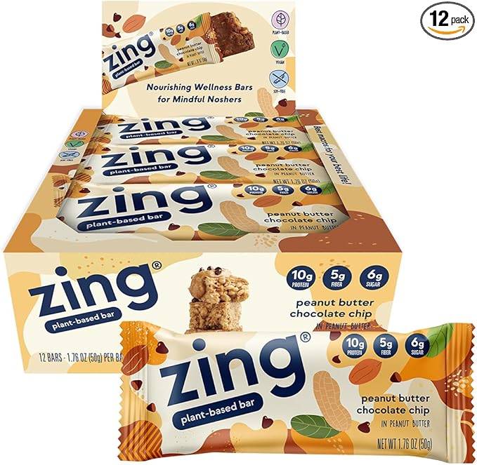Zing Peanut Butter Chocolate Chip Vegan Protein Bars, Gluten Free with High Protein, High Fiber, Dairy Free Nutrition Bars, Plant Based Protein, Kosher, Low Sugar, No Sugar Alcohols - 12 count