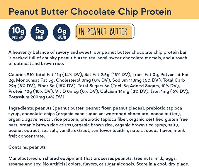 - A Nutritive Snack Bar that Packs a Flavorful Punch: a heavenly balance of savory and sweet, our Peanut Butter Chocolate Chip protein bar is packed full of chunky peanut butter, real semi-sweet chocolate morsels, and a touch of oatmeal and brown rice.