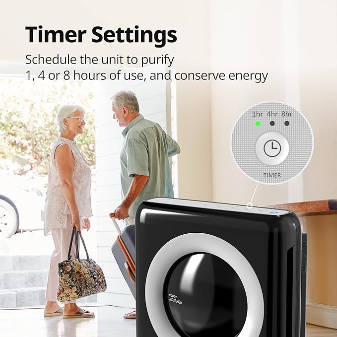 - [Timer] Schedule the unit to purify 1, 4 or 8 hours of use, and conserve energy.
