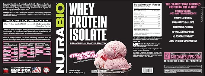 NutraBio 100% Whey Protein Isolate Protein Powder, 25g Protein with Complete Amino Acid Profile, Soy and Gluten Free, Low Carb and Low Calorie Whey Protein Powder, Strawberry Ice Cream, 5 Lbs.