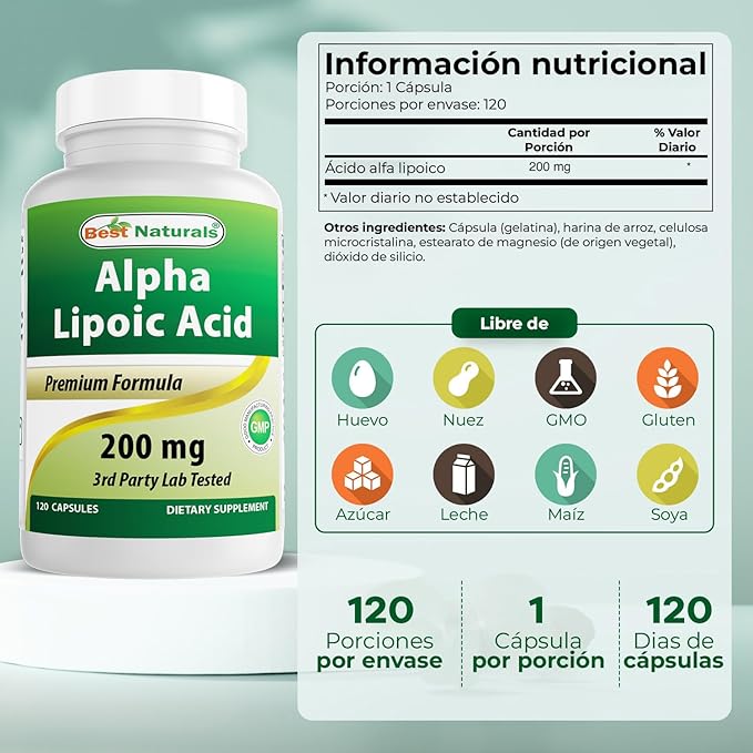 - 3rd Party Lab Tested for Purity & Quality. 200 mg of Alpha Lipoic Acid per Capsule - 120 Capsules per Bottle. Non-GMO & Gluten Free. Proudly Made in USA, GMP Compliant, FDA Registered Facility. No Artificial Color, Flavor or Sweetener, No Preservatives, No Sugar, No Milk, No Corn, No Soy, No Egg, No Lactose, No Gluten, No Wheat, No Yeast, No Fish. Sodium Free.