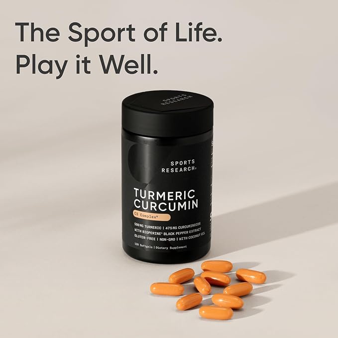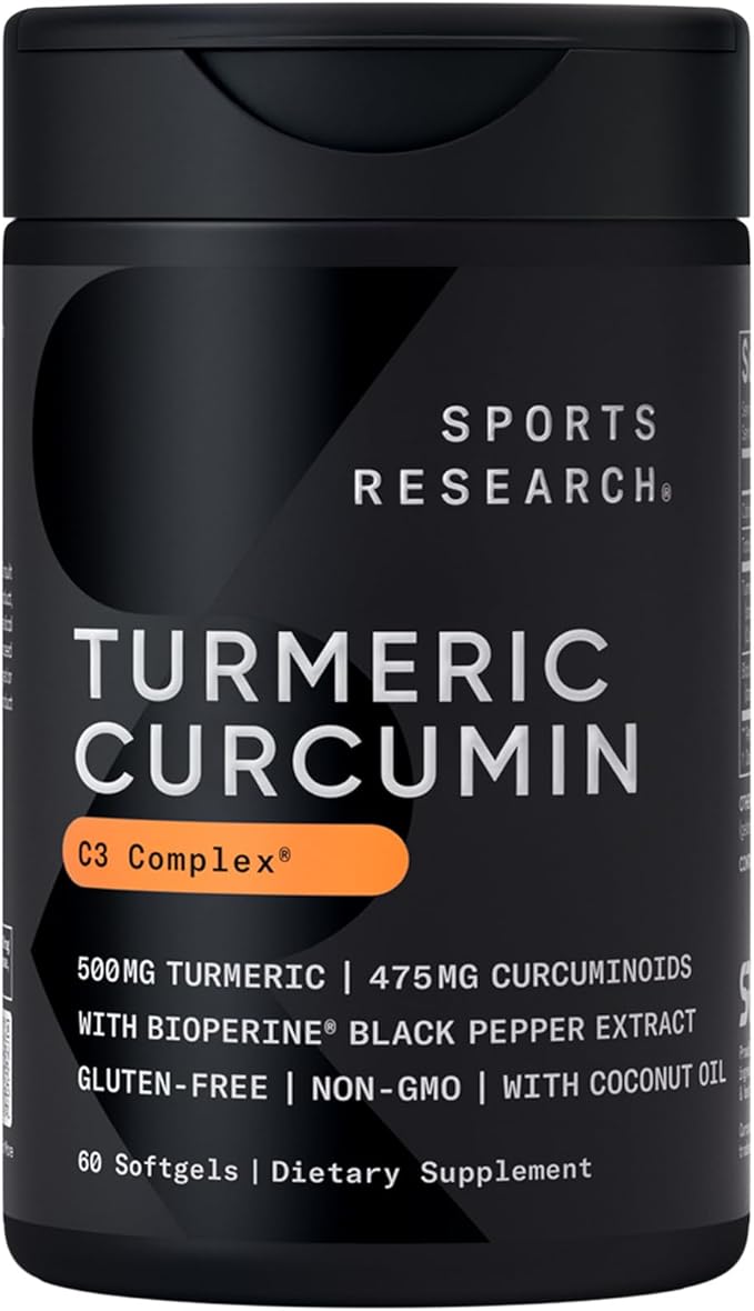 Sports Research Turmeric Curcumin C3 Complex 500 mg, Enhanced & Black Pepper and Organic Coconut Oil for Better Absorption; Non-GMO and Gluten Free - Standardized 95% Curcuminoids (60 Count Softgels)