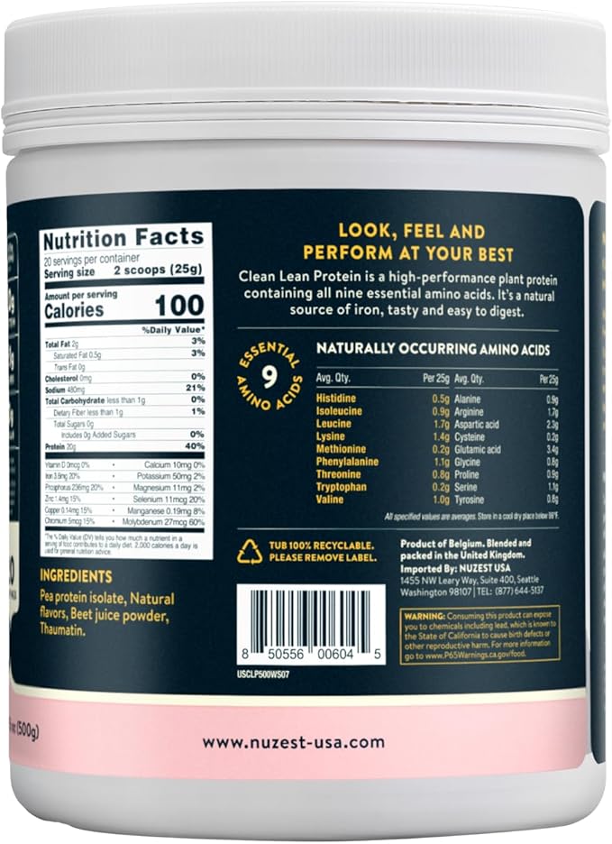 Nuzest - Pea Protein Powder - Clean Lean Protein, Premium Vegan Plant Based Protein Powder, Dairy Free, Gluten Free, GMO Free, Protein Shake (1.1 Pound (Pack of 1), Wild Strawberry)