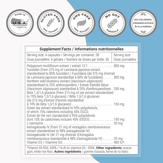 - Recommended Use - Take 4 capsules a day. Contains polygonum multiflorum extract, 80% Fucoidan, Bog Blueberry extract 25% anthocyanidins, 70% beta 1,3/1,6 glucans, green tea extract 95% polyphenols 75% catechins 45% EGCG, L-carnosine, Astragalus membranaceous extract 98% Astragaloside IV, Vitamin D3