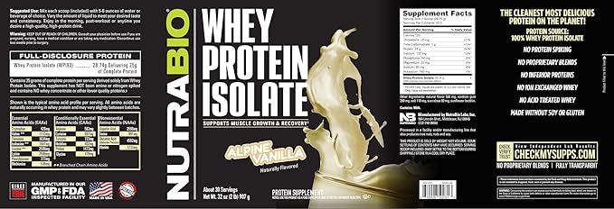 NutraBio 100% Whey Protein Isolate Protein Powder, 25g Protein with Complete Amino Acid Profile, Non-GMO, Soy & Gluten Free, Low Carb, Low Calorie Whey Protein Powder, Alpine Vanilla, 2 Lbs