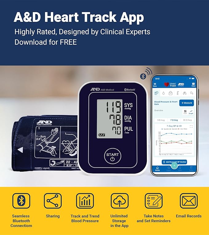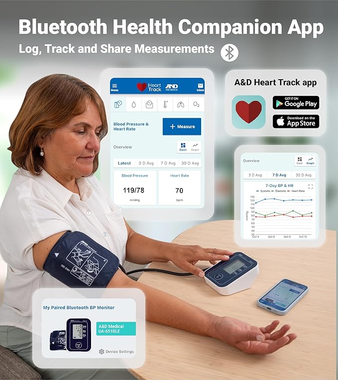 - A&D HEART TRACK APP - THE COMPANION APP: Wirelessly sync the Bluetooth blood pressure monitor (UA-651BLE) to your device and track unlimited measurements with the highly rated A&D Heart Track App. The free app is available in the iOS and Android app stores and requires iOS 12.0 or later & Android 5.0 or above.