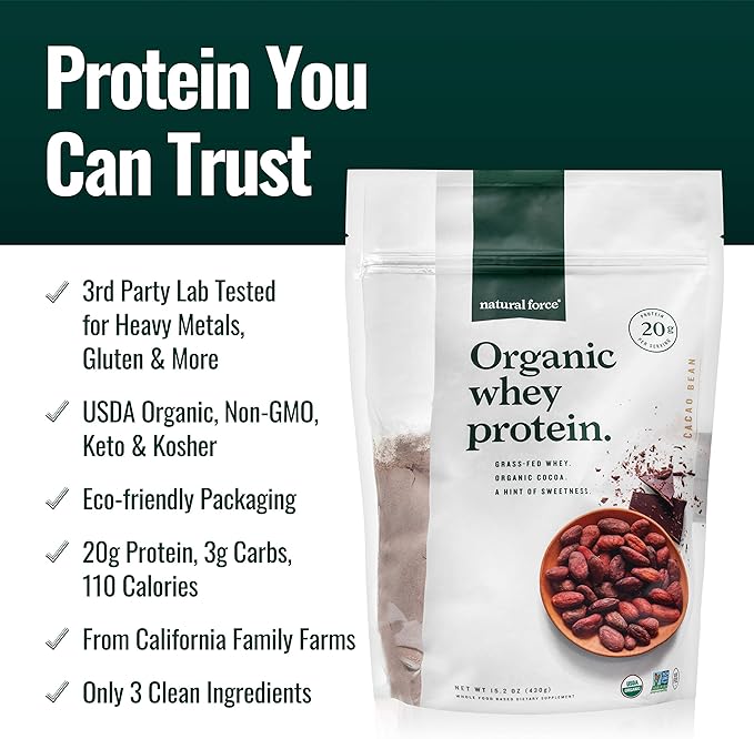 Natural Force Whey Protein Powder – Chocolate – Grass Fed Organic, Pure, Keto & Paleo Friendly, Low Carb, Kosher, Non GMO – 1 Pound