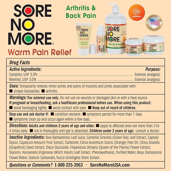 - Targeted Relief for Everyday Discomfort – Use Sore No More Warm arthritis pain relief cream to help alleviate aches and pains in areas like the back, neck, hands, and feet, so you can feel more comfortable throughout your day