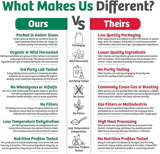 - NO FILLERS. NO GRASS. NO GAS : Other super greens supplements often use low quality fillers like wheatgrass, alfalfa, and broccoli that *sound* good but can cause digestive upset and simply don’t deliver the nutrient density of Infinity Greens. Instead, we use a base of Klamath blue green algae & spirulina - two extremely potent superfoods that delivers dramatic health benefits, even in small quantities.