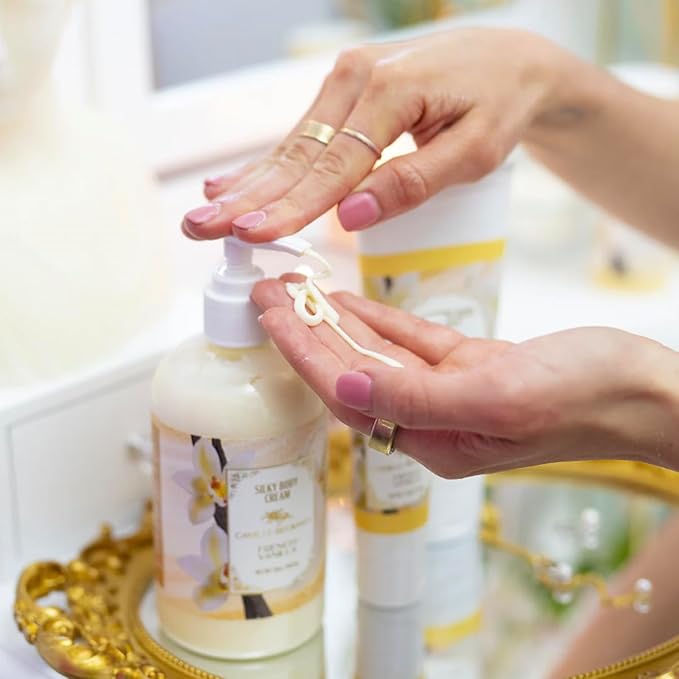Camille Beckman French Vanilla Scented Silky Body Cream, Daily Moisturizer for All Skin Types | Non-Greasy Vegan Formula to Nourish and Soften Hands and Body, 13 Ounce