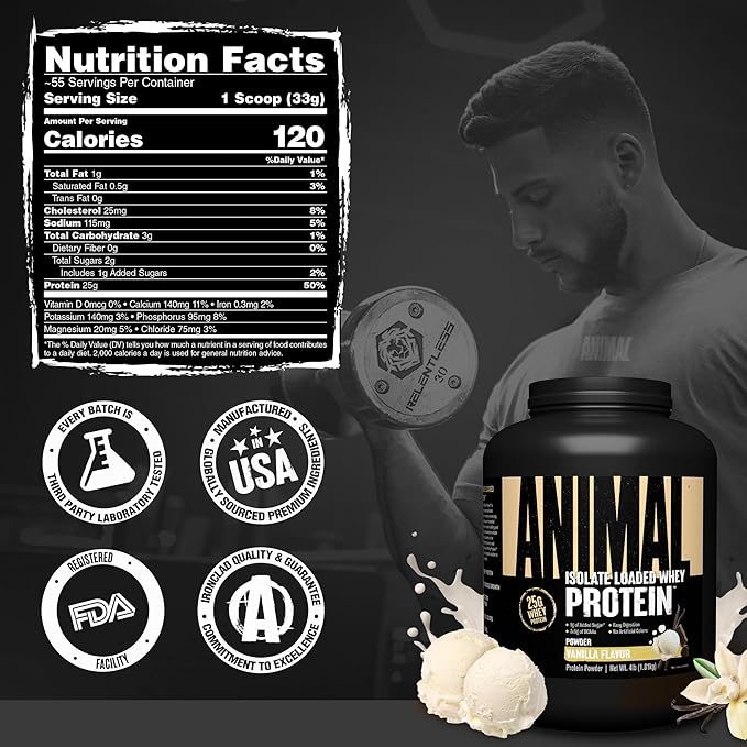 - Premium Whey Protein Isolate - Loaded with the highest quality protein sources, Animal Whey delivers a potent punch of 25 grams of protein per serving. Fast absorbing & high bioavailability to support muscle growth and recovery