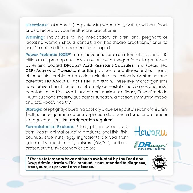 - ππππππππππ ππππππ-πππππππππ ππππππππ: Power Probiotic 100B is delivered in patented DRcaps to promote passage through a low pH environment and successful delivery of the probiotics into the large intestine & colon. With Power Probiotic 100B, you get the powerful probiotic support you need and proven results.