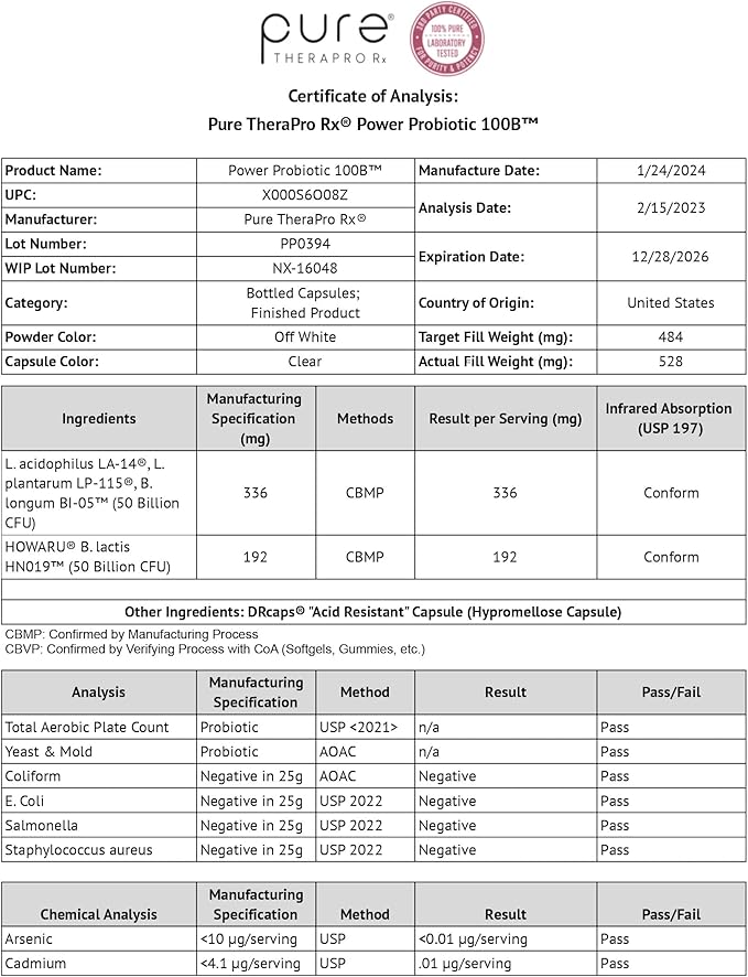 - ππππππ & πππππππππ πππππππ: Power Probiotic 100B from Pure TheraPro Rx is a 4-strain probiotic supplement containing 100 Billion CFU of Lactobacillus Plantarum, Bifidobacterium Longum, and other beneficial bacteria to promote a healthy balance of gut flora. Take 1 capsule daily for a full 30-day supply of digestive and immune support.