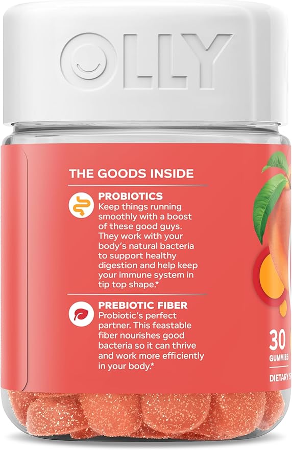 OLLY Probiotic + Prebiotic Gummy, Digestive Support and Gut Health, 500 Million CFUs, Fiber, Adult Chewable Supplement for Men and Women, Peach, 30 Day Supply - 30 Count