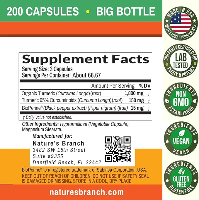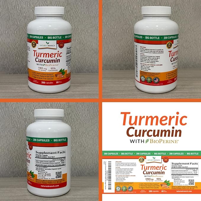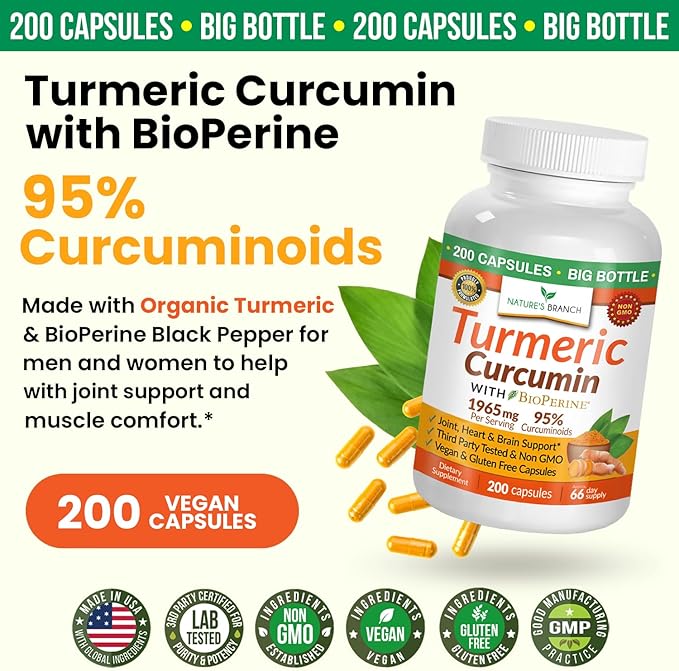 - 200 CAPSULES HIGH POTENCY TURMERIC CURCUMIN: Carefully formulated with organic turmeric root, 95% standardized curcuminoids, and BioPerine (black pepper extract) for maximum absorption. Each serving delivers powerful antioxidants for healthy joint support, active living and optimized wellbeing.*