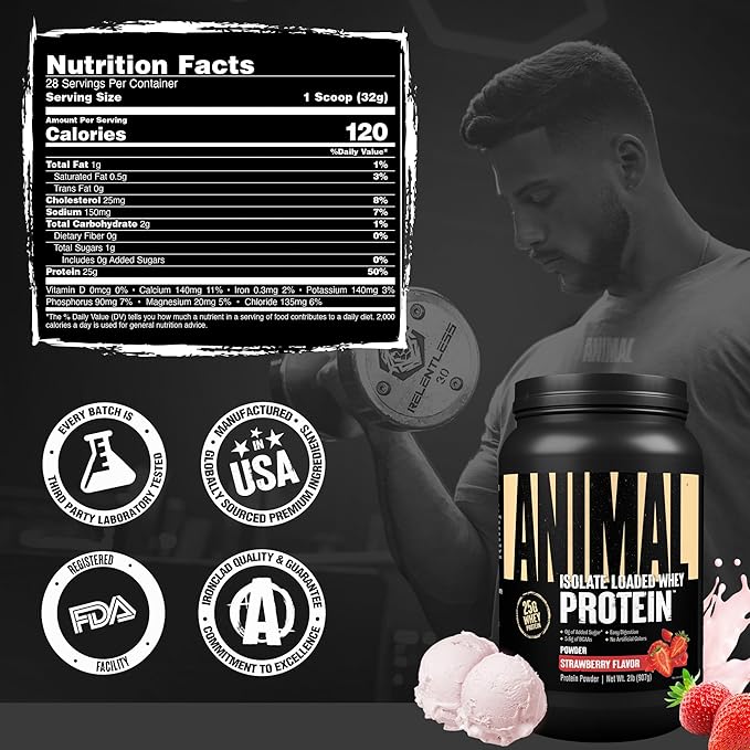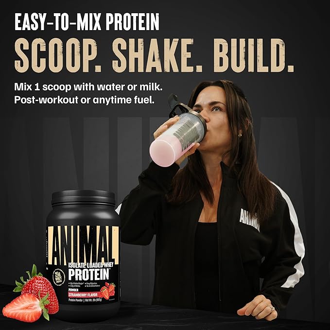 Animal Whey Isolate Protein Powder - Loaded for Pre & Post Workout Muscle Builder and Recovery with Digestive Enzymes for Men & Women - 25g Protein, Great Taste, Low Sugar - Strawberry 2 lbs