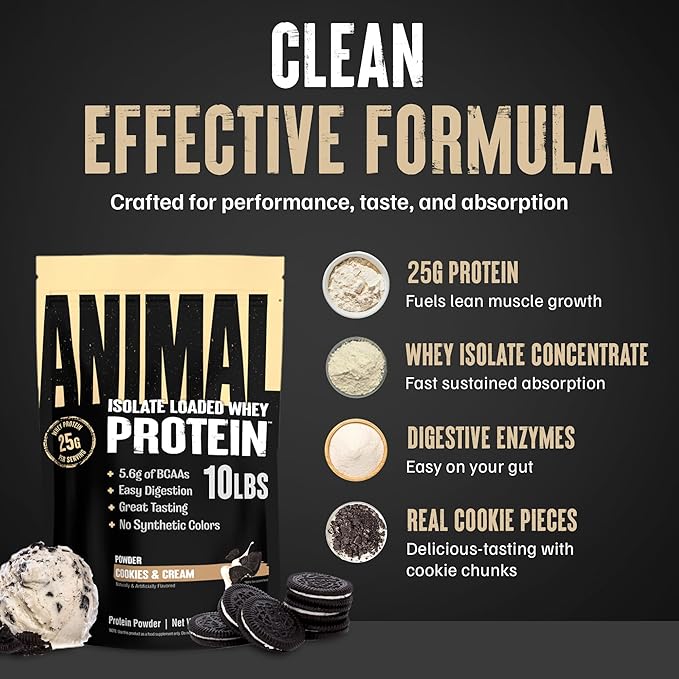 Animal Whey Isolate Protein Powder - Loaded for Pre & Post Workout Muscle Builder and Recovery with Digestive Enzymes for Men & Women - 25g Protein, Great Taste, Low Sugar - Cookies & Cream 10 lbs