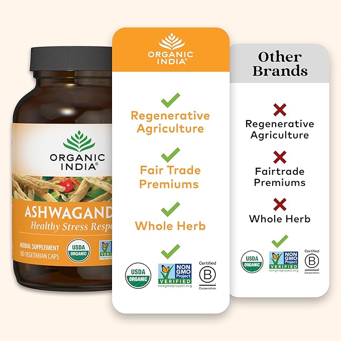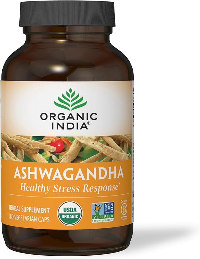ORGANIC INDIA Ashwagandha Capsules - Organic Ashwagandha Supplement - Vegan Ashwagandha Root, Gluten-Free, Kosher, Non-GMO, Supports Stress Relief, Energy, and Sleep - 180 Capsules