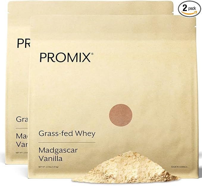 - Build Muscle and Improve Recovery: Promix Whey Protein Powder is a cold-processed and acid-free bioactive native whey made from milk of grass-fed cows. This lightly sweetened, smooth powder contains naturally occurring glutathione and immunoglobulins, as well as sunflower lecithin for improved absorption and blending. Madagascar Vanilla flavor. 67 servings per container, 2 scoops per serving.