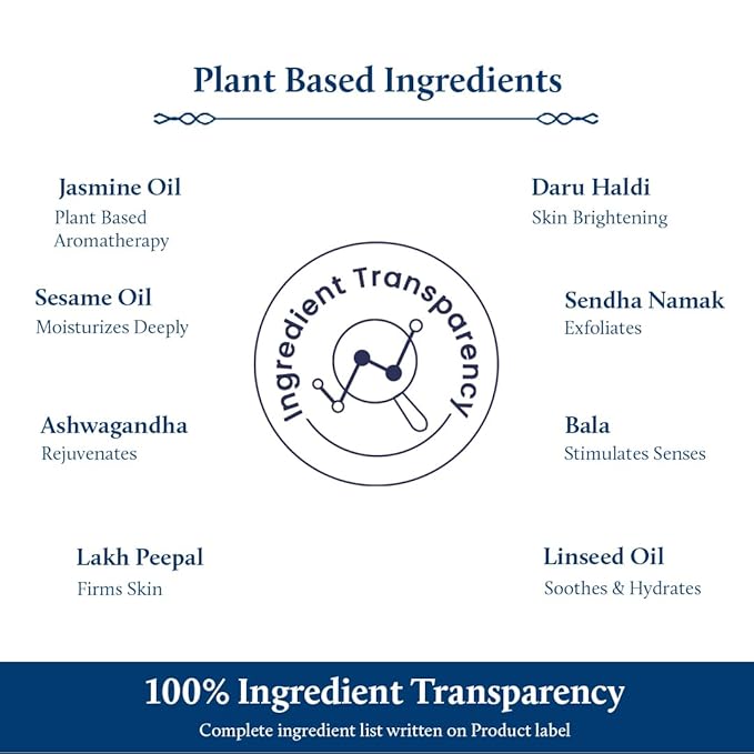 - Great Body Oil for Dry Skin - This body massage oil is a thoughtful potent blend of holistic healing herbs such as Jasmine, Ashwagandha, cold pressed Sesame Oil & Linseed Oil that penetrates into the deeper tissues. It provides intense moisturization and nourishment to the skin which making it appear young and fresh.