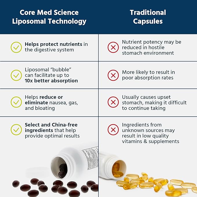 - MAXIMUM ABSORPTION LIPOSOMAL TECHNOLOGY: Unlike traditional supplements where the active ingredients get destroyed by acids in the digestive tract, Core Med Science uses Liposomal Technology to protect nutrients with a liposomal “bubble” to safely deliver nutrients into the bloodstream for optimal absorption. Provides up to 80% more absorption and is also gentler on your stomach.