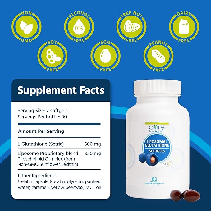 - A MULTITUDE OF PROTECTIVE BENEFITS: Core Med Science’s 60 Count Liposomal Glutathione supplement supports the immune system by helping to prevent cellular damage that occurs as you age. Our easy-to-swallow Glutathione softgels are formulated with liposomal technology for quick and efficient absorption. Includes 2 softgels per serving (30 servings).