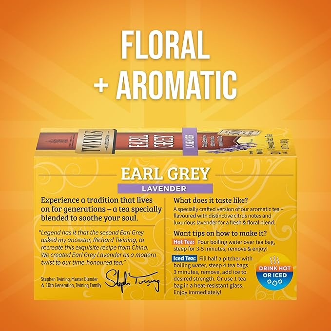 - CLASSIC BLACK TEA & FRESH LAVENDER: Fragrant and flavoured with distinctive notes of citrus and bergamot, this Earl Grey tea adds fresh lavender for even more aroma and taste; Caffeinated, 20 Count, Pack of 1