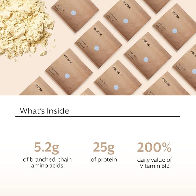 - Support Recovery and Build Muscle: Promix Vegan Protein Powder is a highly bioavailable vegan protein isolate made from organic Canadian yellow peas. This light- and smooth-tasting powder is easy to digest and blend. Grown and processed in North America. Unflavored. 38 servings per container, 2 scoops per serving.