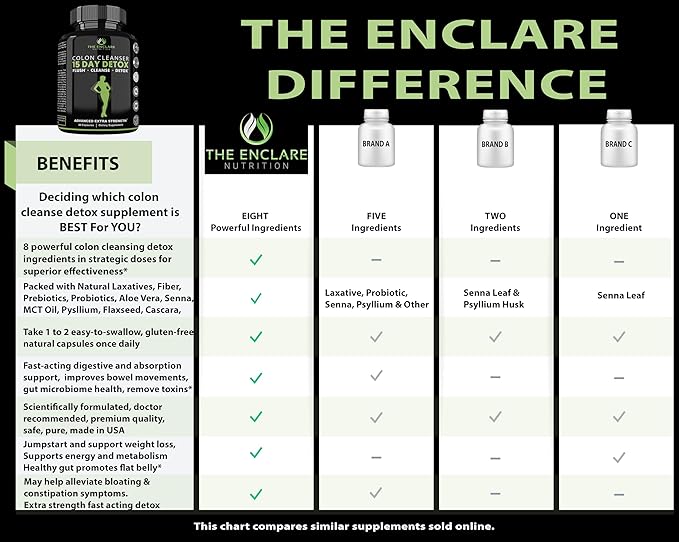 - CLEAN INGREDIENTS - TRUSTED PREMIUM QUALITY: Advanced colon cleanse proudly made in the USA with natural ingredients that work together to support a complete colon cleanse detox. Our dr formulated Non-GMO 15 day cleanse gut support is manufactured in an FDA-inspected and GMP-certified facility. Every batch is rigoriously Third-party tested for purity and potency, so you get a consistent, clean gut cleanse supplement. With Enclare, you’re choosing results backed by years of wellness expertise.