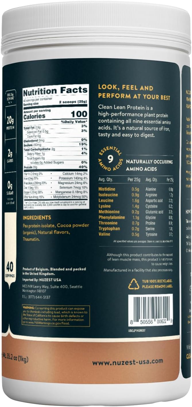 Nuzest - Pea Protein Powder - Clean Lean Protein, Premium Vegan Plant Based Protein Powder, Dairy Free, Gluten Free, GMO Free, Protein Shake, Rich Chocolate, 40 Servings, 2.2 lb