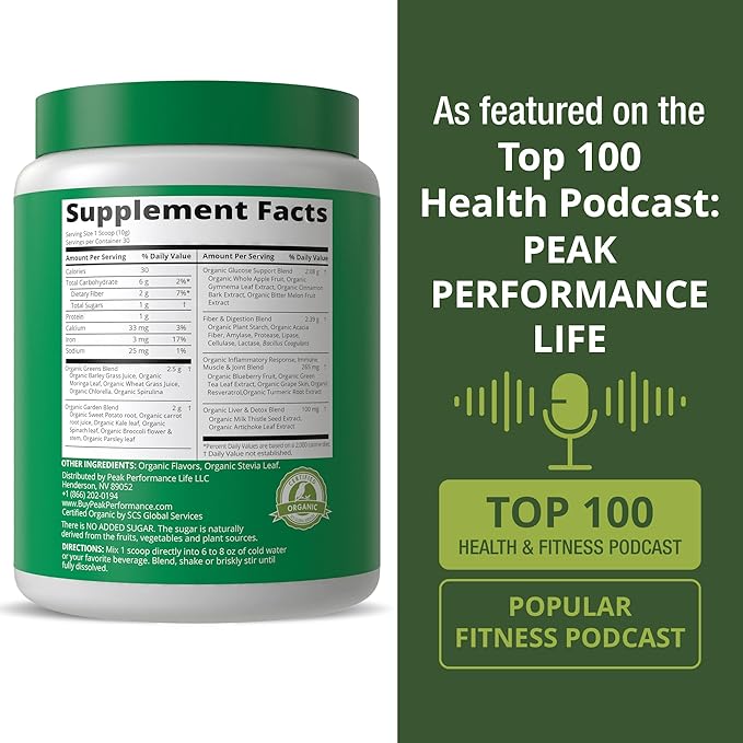 Peak Performance Organic Greens Superfood Powder. Best Tasting Super Greens Powder with 25+ Organic Ingredients for Max Energy and Athletic Performance. Vegan Keto Green Juice Daily Drink