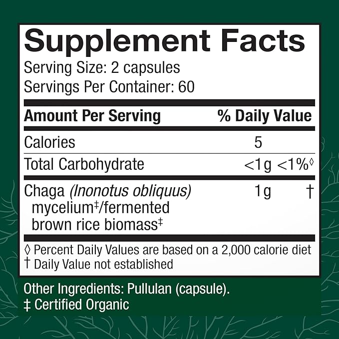 - Chaga Mushroom Capsules: Our mushroom supplement is formulated with Chaga, a well-known beneficial mushroom species, to support health and antioxidant activity*