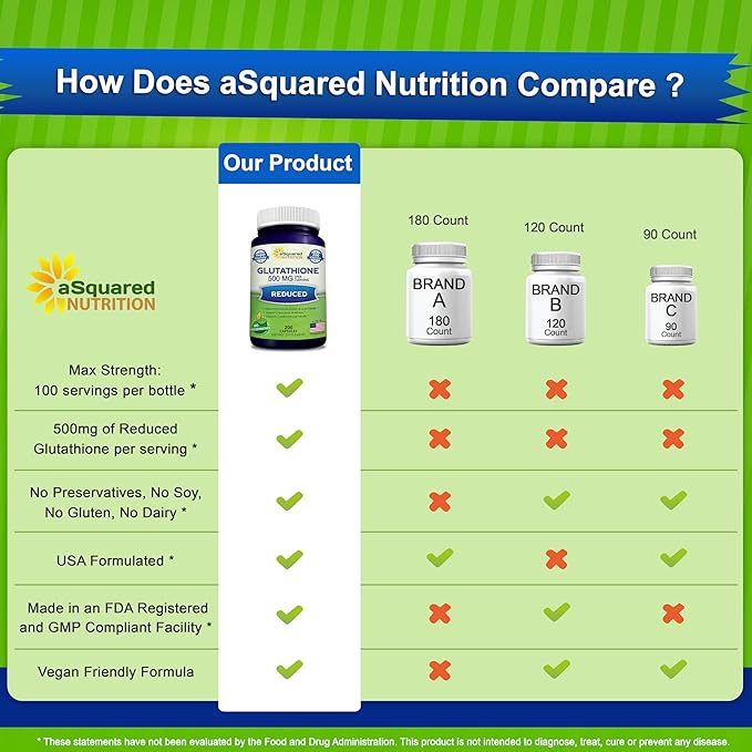 aSquared Nutrition Reduced Glutathione 500mg Per Serving Supplement -200 Capsules -L-Glutathione Antioxidant to Support Liver Health & Detox - Max Strength Powder Pills to Help Immune & Brain Function