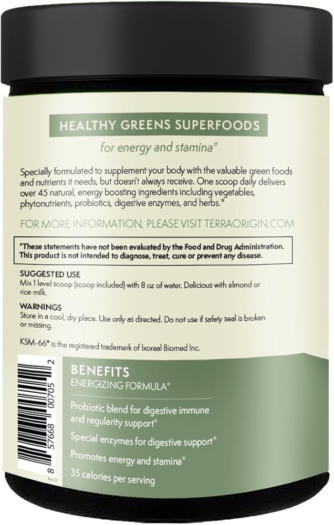 - SUPERFOOD GREENS POWDER: For energy, stamina, immune support this nutritionally packed formulation delivers over 45 natural, energy boosting vegetables, phytonutrients, probiotics, digestive enzymes and herbs.*