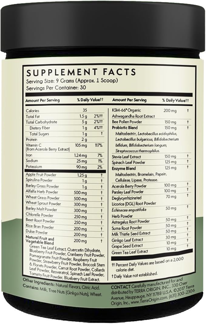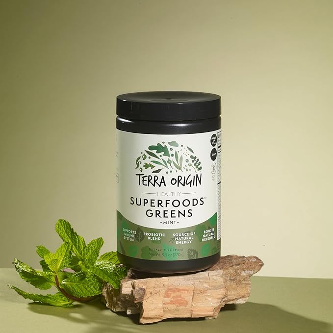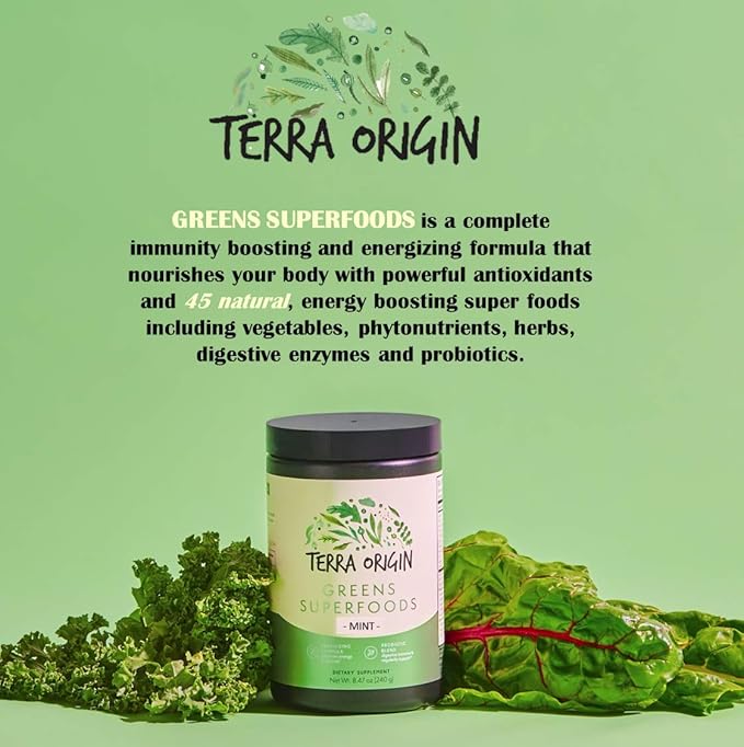 TERRA ORIGIN Healthy Superfood Greens Powder Drink with Probiotics & Ashwagandha | Adaptogen & Digestive Enzyme Fruit and Veggie Blend | for Gut Health, Energy, Immune Support | 30 Servings | Mint