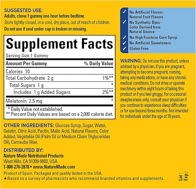 - Nature Made Melatonin Gummies 2.5 mg is a lower dose melatonin for adults supplement that helps you fall asleep faster