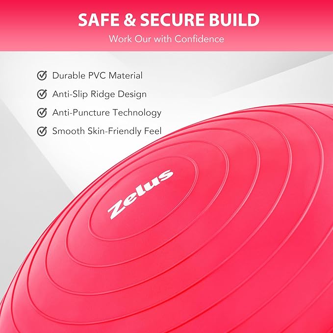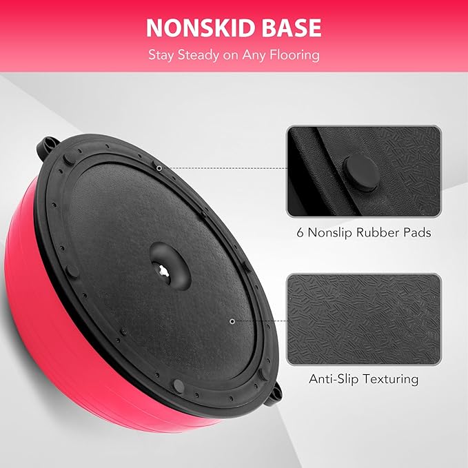 - BALL PUMP INCLUDED: A complete combo, this half-dome stability ball comes with a complimentary foot pump that makes it easy to get fully inflated to 9.8” in under 5 minutes. The ball’s high-quality air valve prevents air leakage and extends service life.