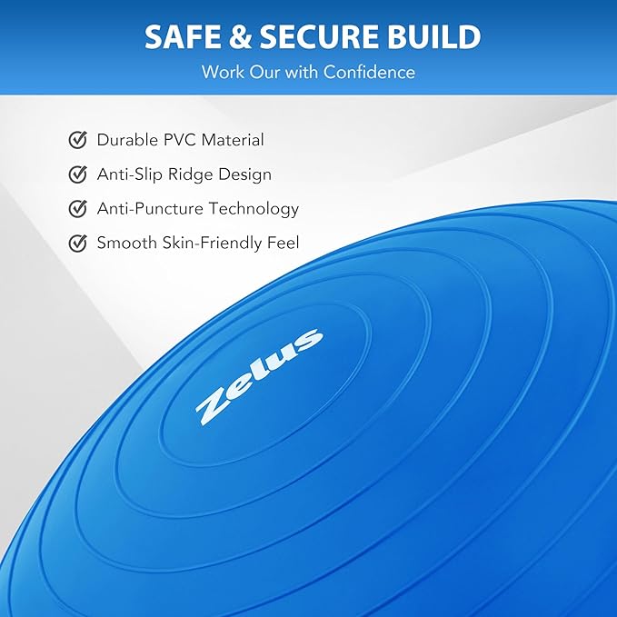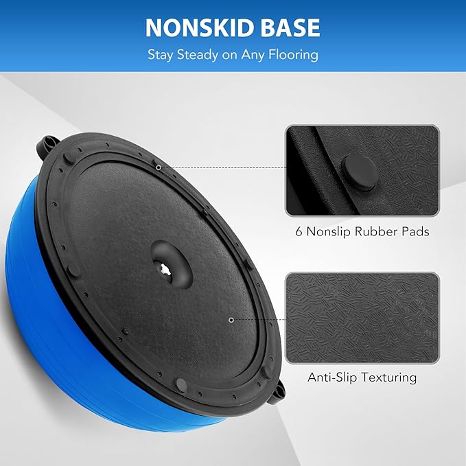 - BALL PUMP INCLUDED: A complete combo, this half-dome stability ball comes with a complimentary foot pump that makes it easy to get fully inflated to 9.8” in under 5 minutes. The ball’s high-quality air valve prevents air leakage and extends service life