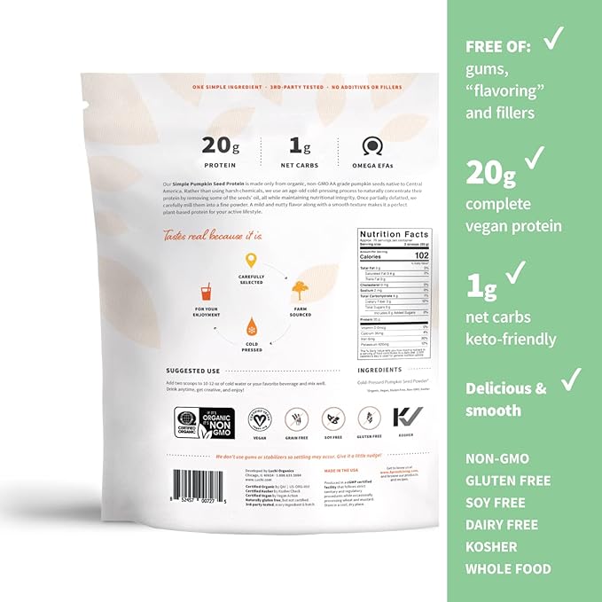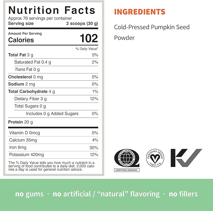 - PURE ORGANIC PLANT PROTEIN - Organic plant protein powder without artificial sweeteners, made from organic, non-GMO AA grade pumpkin seeds that have been cold-pressed.