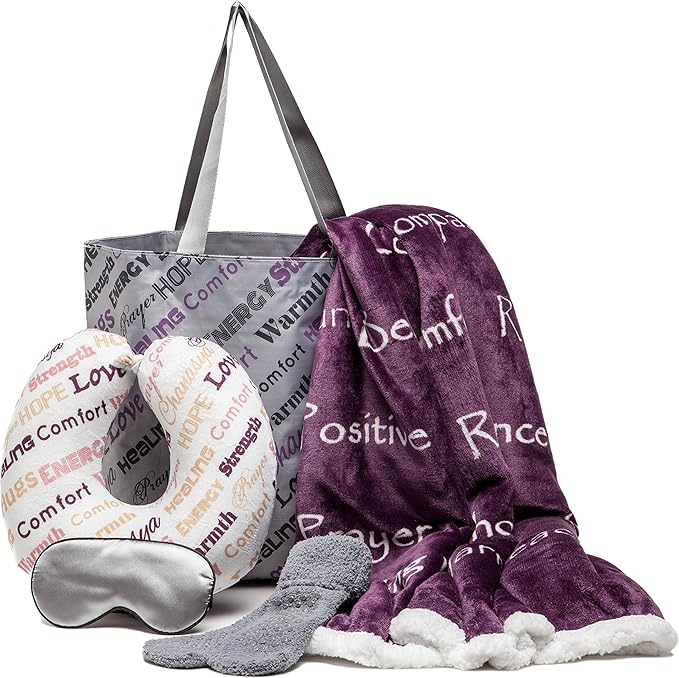 Chanasya 5-Piece Warm Hugs Positive Energy Healing Thoughts Comfort Caring Message Print Combo Gift Pack Throw Blanket, Neck Pillow, Eye Mask, Tote Bag, Socks - for Women Men Cancer Hospital Aubergine